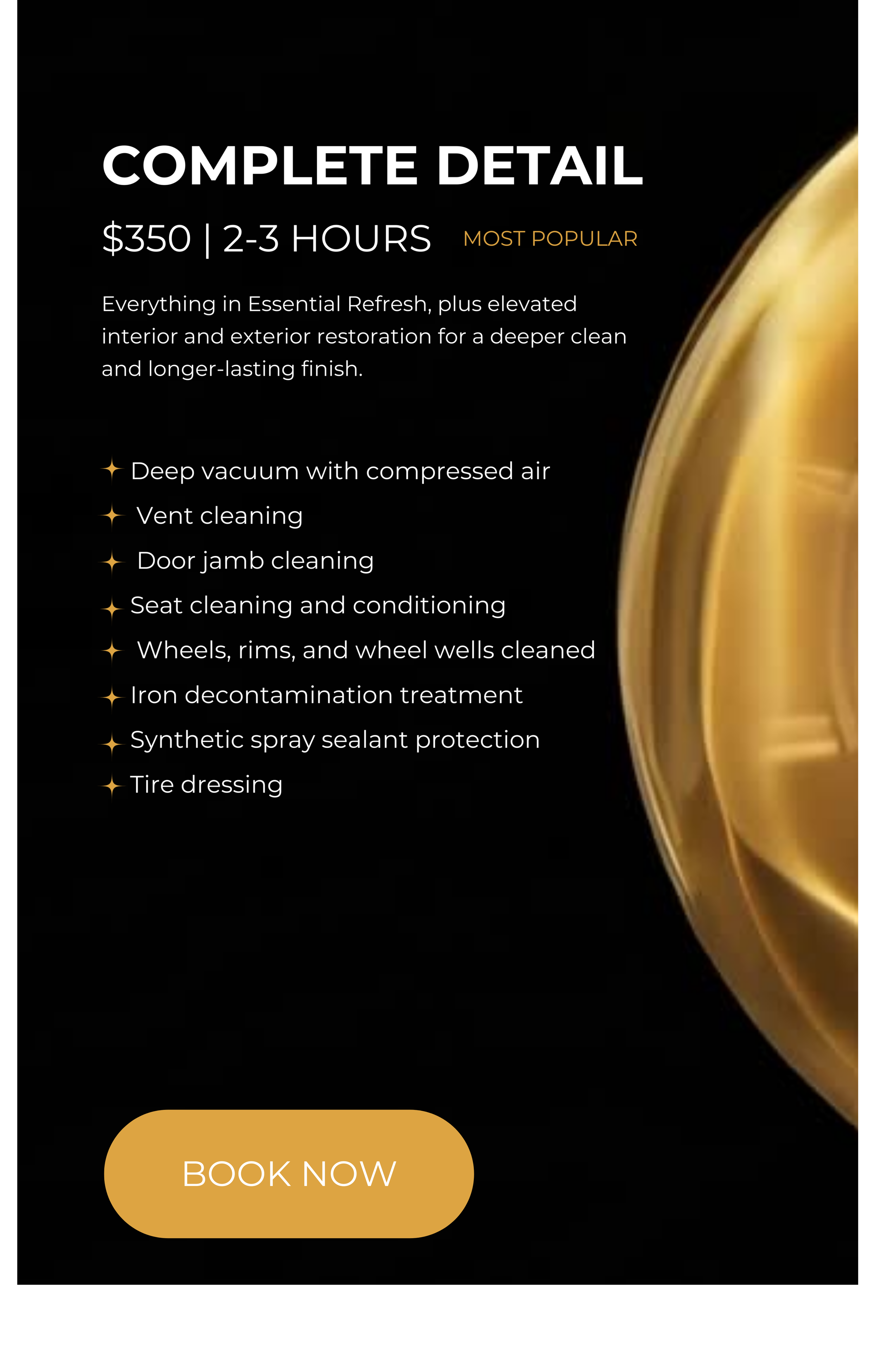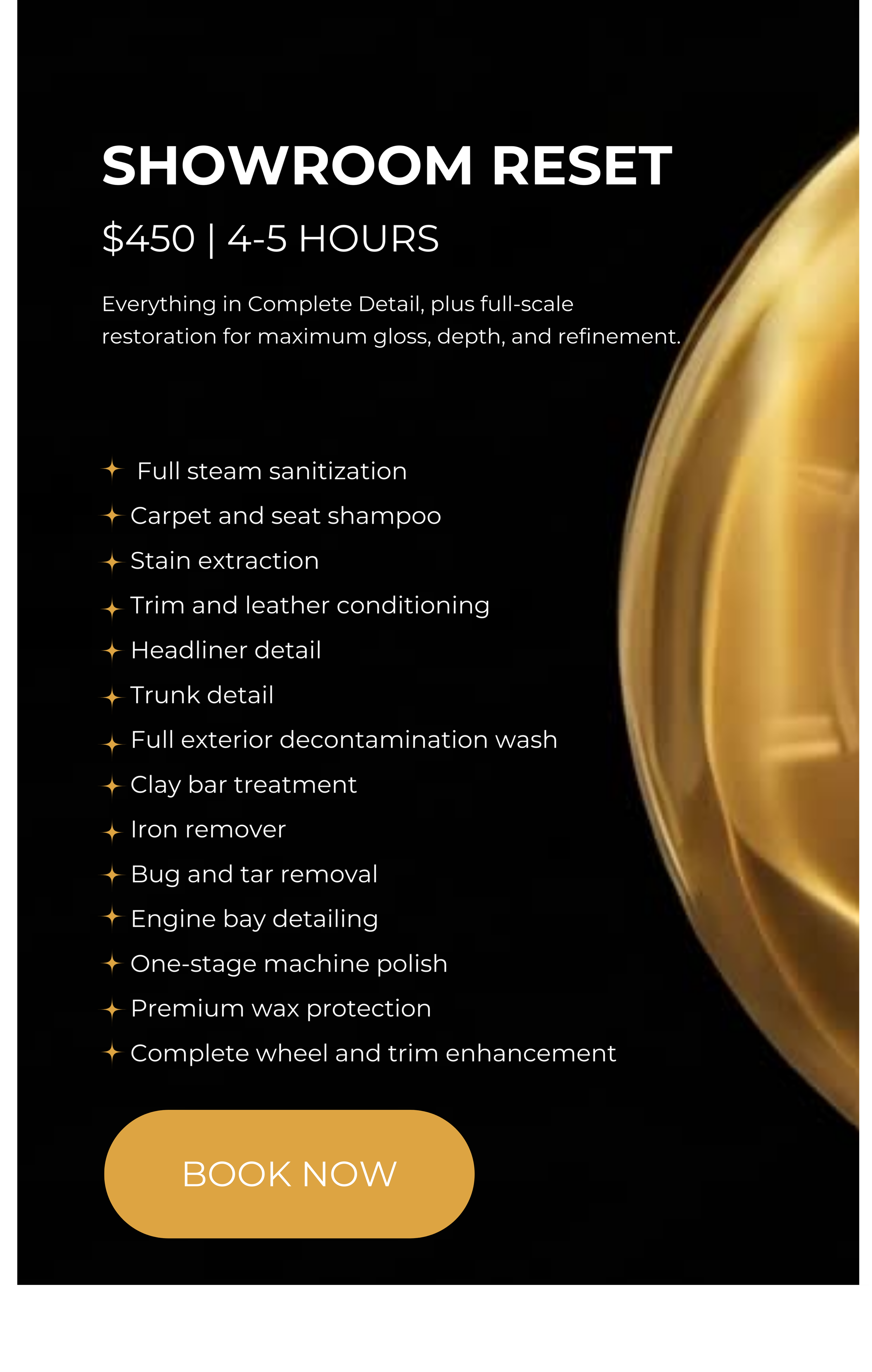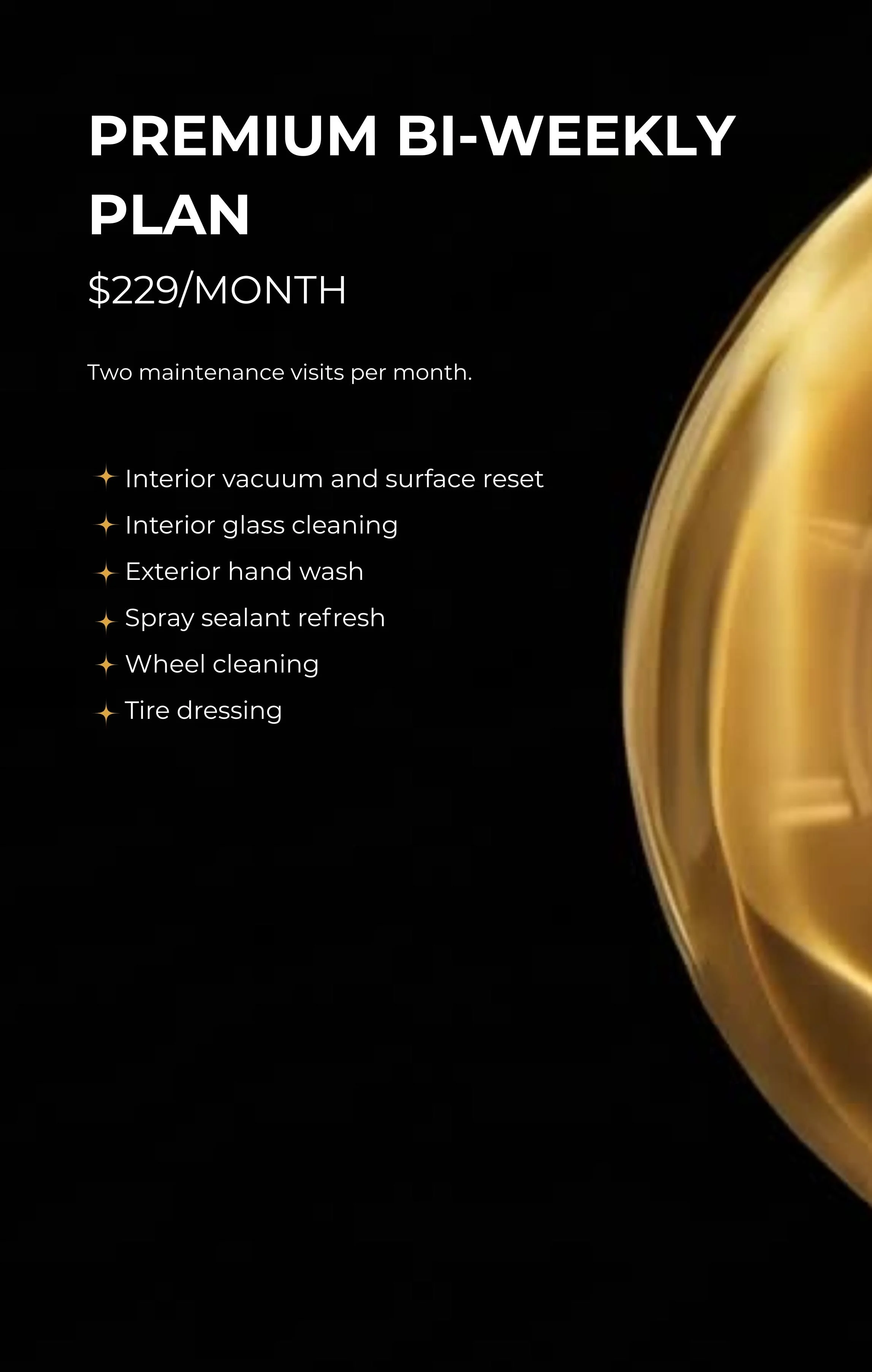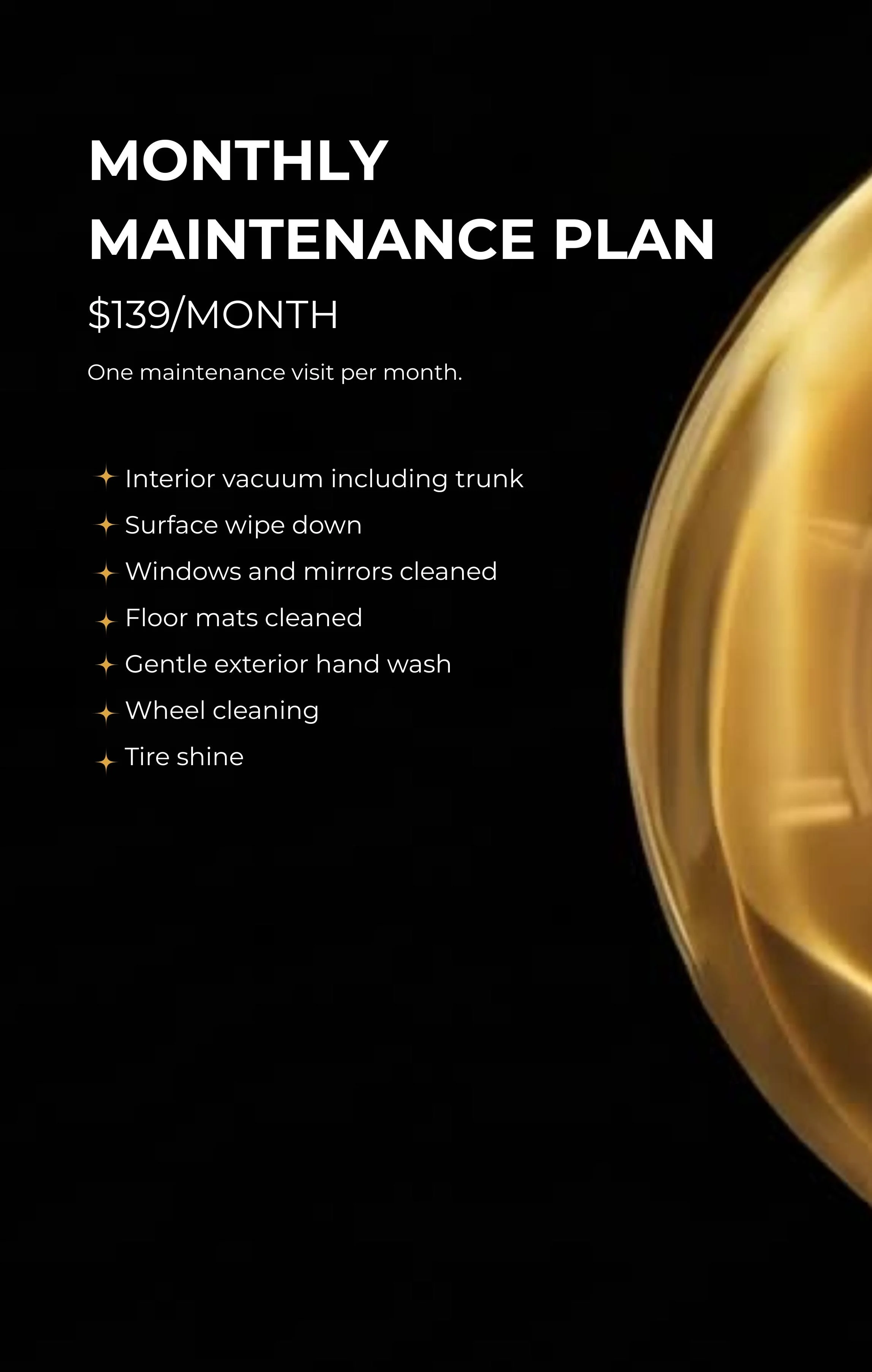 Exclusive maintenance plans designed to preserve your vehicle’s condition year-round. Membership is available after completing a Complete Detail or Showroom Restoration service.